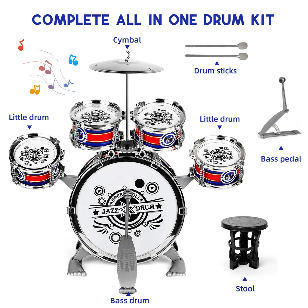 Strong structure of stool and the drum set allows children to sit safely and play drums. The jazz drum set is made of alloy, plastic and cardboard, which is light but strong and reliable. The drum sounds are loud and clear, allowing children to play wonderful music.