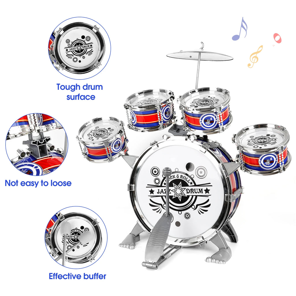 This drum kit provides a great way for children to develop their musical abilities early in their lives. Moreover, playing drums can promote children's hearing development, improve children's concentration, and exercise children's flexibility and coordination.